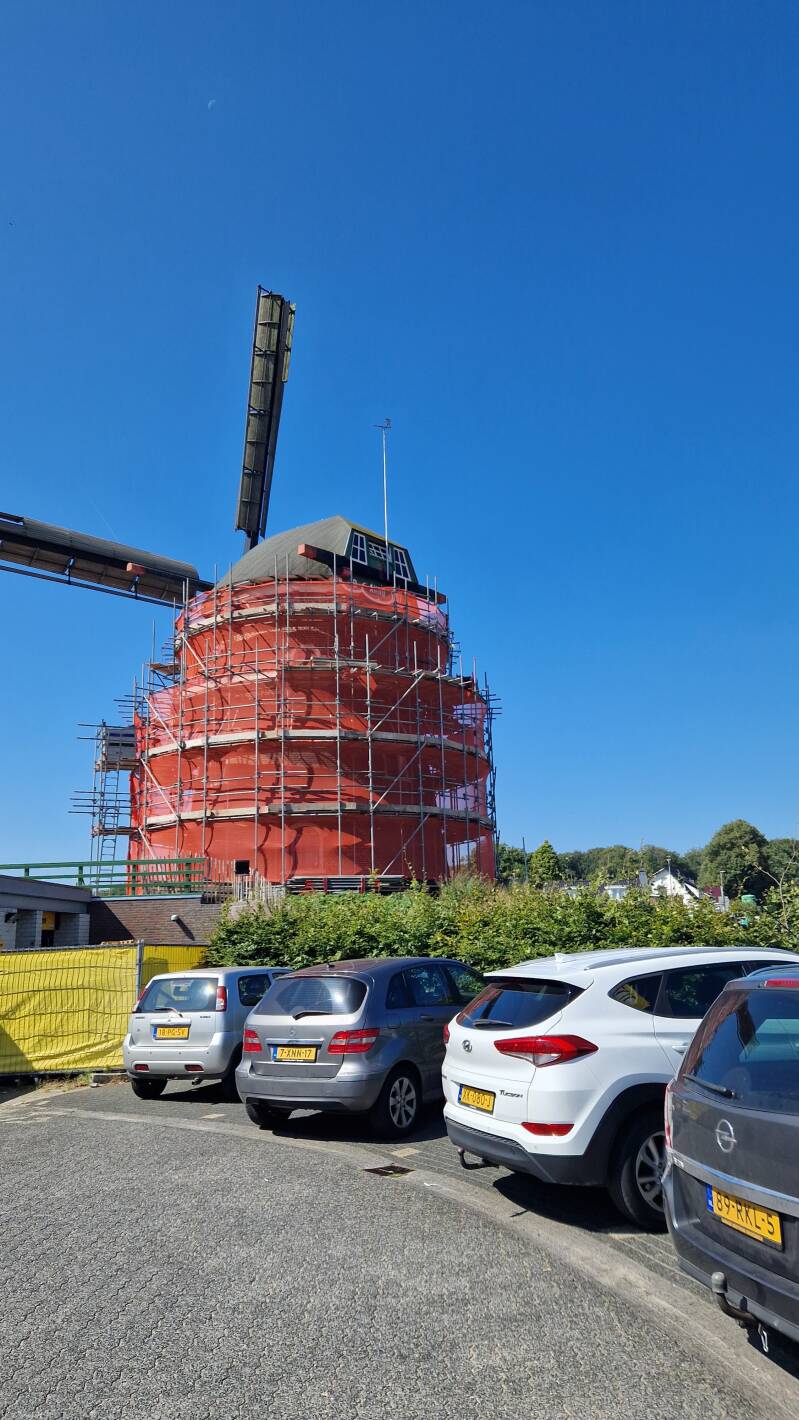De Zuidmolen zoals we hem nog nooit zagen. Er wordt gewerkt aan de renovatie van de Zuidmolen. Steigers en rood doek geven nu wel een heel apart beeld van een van de historische blikvangers van Groesbeek.